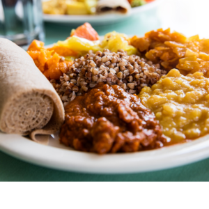האוכל המסורתי האתיופי מבוסס על מרכיבים טריים ובריאים, ושימוש בתבלינים ייחודיים כמו נוג, דאבו, פירפיר וואט ועוד. לחם האינג’רה הוא הלב של כל הארוחה רך, חמצמץ, ומעניק חוויית אכילה משותפת. לצד האינג’רה מוגשים תבשילים שונים כמו דורו וואט, שירו וואט, טיבס, אליצ'ה ירקות ומסרות מיוחדות, שכל אחד מהם מספר סיפור אישי ותרבותי על הקהילה היהודית-אתיופית. התבלינים אינם רק לטעם הם נושאים משמעויות רפואיות, רוחניות ומסורתיות, והם חלק בלתי נפרד מהחיים בקהילה.